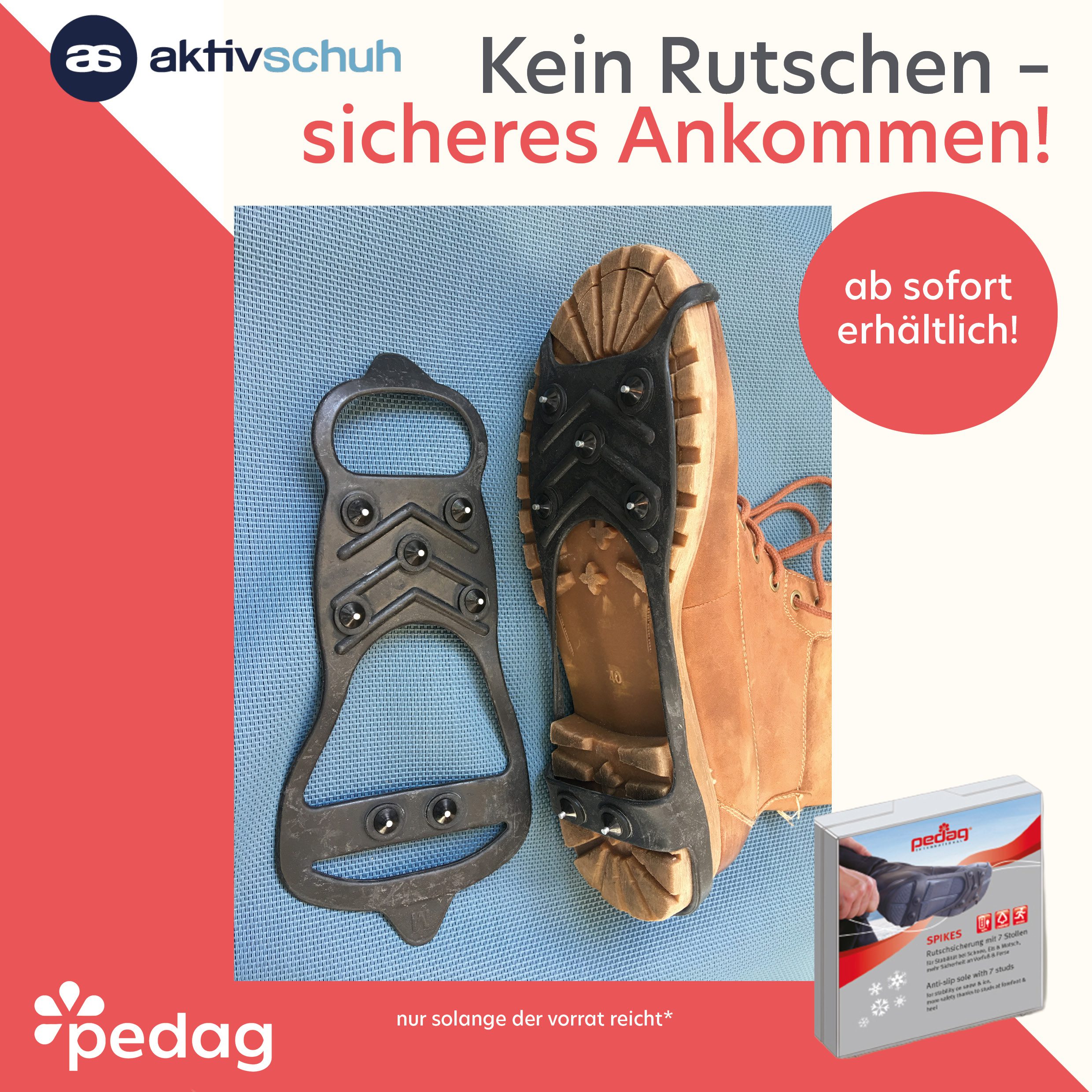 aktiv-schuhspikes lassen sich einfach unter den schuhen befestigen und sorgen für mehr halt auf eis und schnee. erhältlich in der aktiv-schuh-filiale.* * nur solange der vorrat reicht12.01.2026Aktiv-Schuh