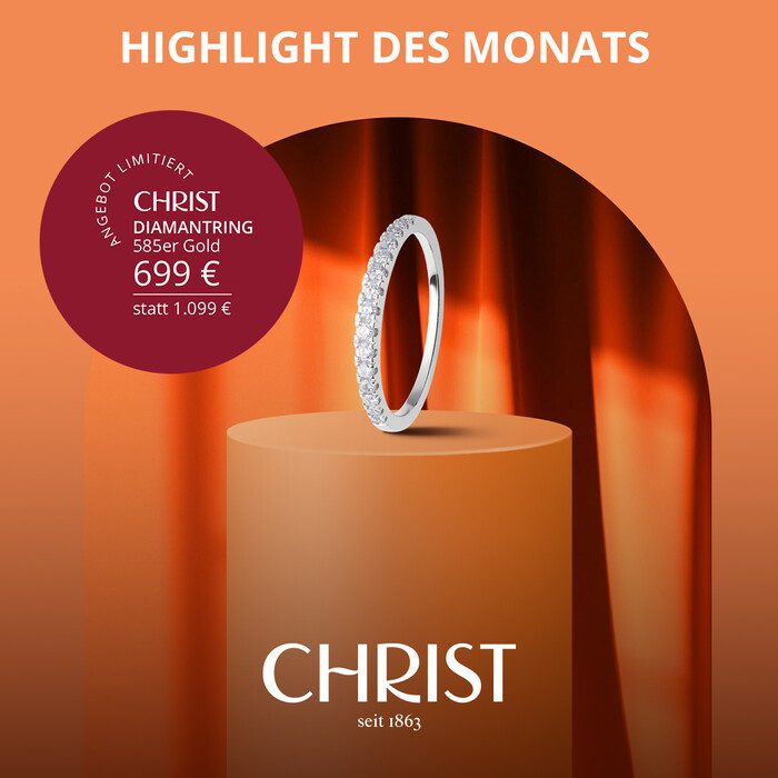 christder memoire-ring aus 585er gelb- oder weißgold ist eine hommage an die schönsten erinnerungen. funkelnde weiße diamanten mit insgesamt etwa 0,24 karat bilden in pavéfassung eine elegante linie und verleihen dem ring eine besonders edle ausstrahlung. das zeitlose design macht diesen fingerschmuck zu einem stilvollen begleiter für jeden anlass – als geschenk für einen besonderen […]01.04.2026 bis 30.04.2026Christ