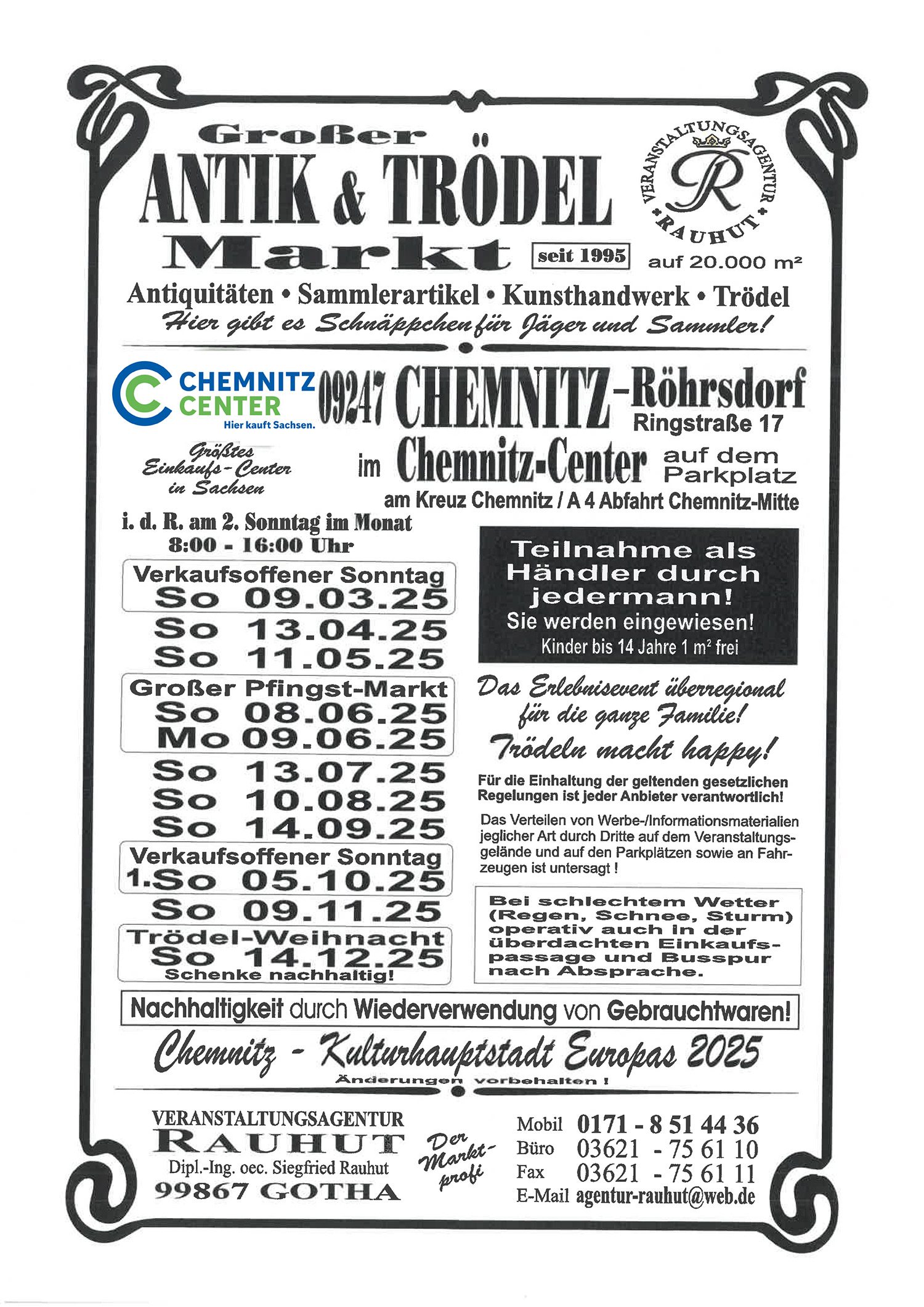 Im Chemnitz Center findet ein großer Antik- und Trödelmarkt statt. Der Markt beginnt jeweils um 8:00 Uhr und findet auf dem Parkplatz des Chemnitz Centers in Röhrsdorf statt. Der Markt ist ein überregionales Ereignis und findet seit 1995 statt. Er ist bekannt für seine große Auswahl an Antiquitäten, Sammlerstücken, Kunsthandwerk und Trödel. Auch für Familien ist der Markt geeignet, da Kinder mit kindertypischen Artikeln einen kostenlosen Standplatz von 1 m² erhalten. Die nächsten Termine: