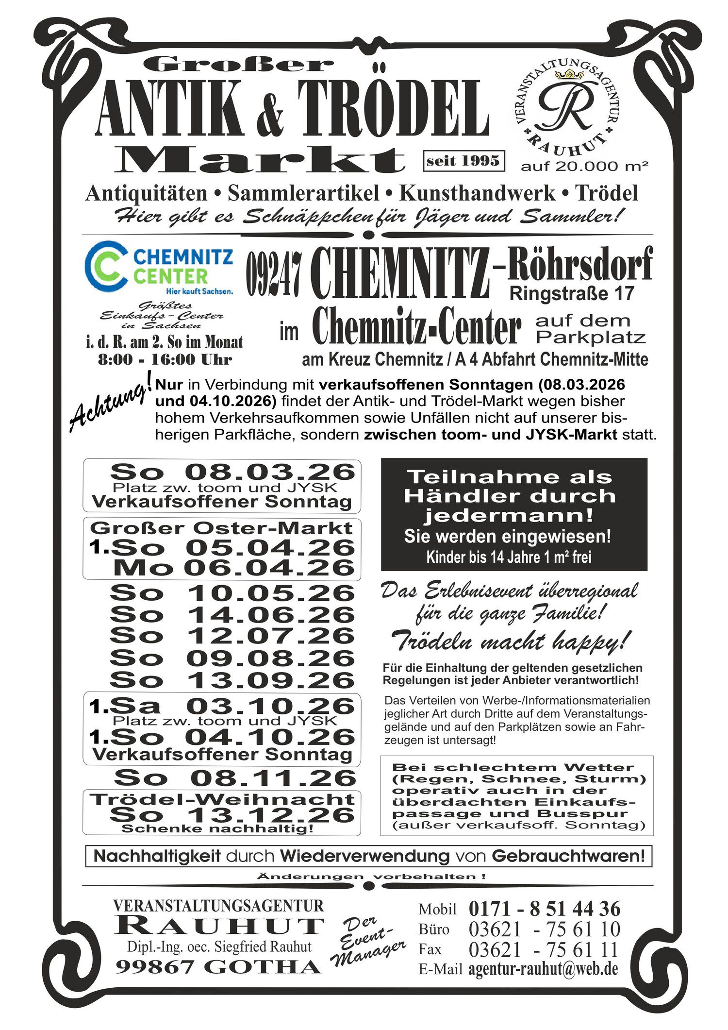 Im Chemnitz Center findet ein großer Antik- und Trödelmarkt statt. Der Markt beginnt jeweils um 8:00 Uhr und findet auf dem Parkplatz des Chemnitz Centers in Röhrsdorf statt. Der Markt ist ein überregionales Ereignis und findet seit 1995 statt. Er ist bekannt für seine große Auswahl an Antiquitäten, Sammlerstücken, Kunsthandwerk und Trödel. Auch für Familien ist der Markt geeignet, da Kinder mit kindertypischen Artikeln einen kostenlosen Standplatz von 1 m² erhalten.